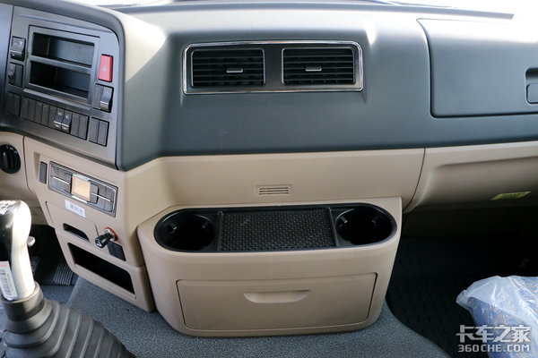 因为豪瀚J6G的驾驶室是半平地板设计,所以空间还是非常宽敞的,正前方中间是抽屉、杯座和防滑置物台组成的部位;上面则是空调出风口,整体来看非常美观,并且简洁明了。