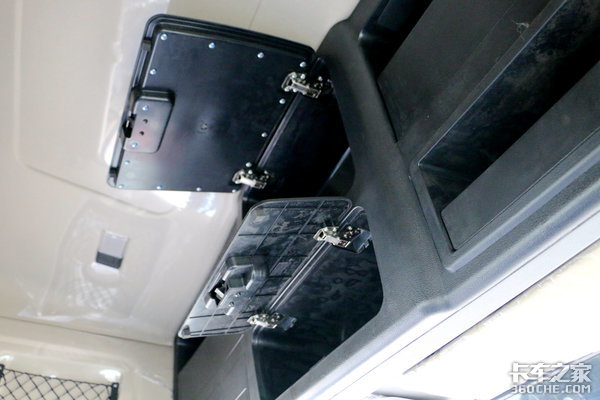 驾驶室上方是储物箱,必须但是并不随手就用的生活用品,可以放在储物箱里,盖板采用合页设计,开合度也是非常不错的。
