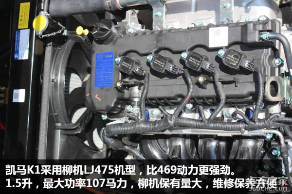 除了新款的造型和舒适的驾乘空间,凯马K1最值得称道的就是它那扎实的底盘和成熟的动力配置:采用柳机LJ4A15Q也就是475机型,相对于以前的469机型,新款车型的排量大,功率大,扭矩也大,满足国五排放标准。柳机是汽油轻卡里公认的成熟动力总成,卡友们可以放心使用。
