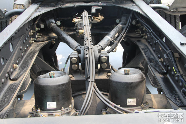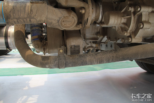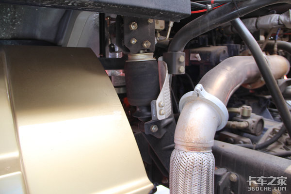驾驶室采用4点悬浮设计,后气囊带有护罩,可以防止发动机排气的高温对气囊产生的影响,进而提高气囊的使用寿命,减少后期的使用成本。在车辆排气管使用了铸造件的抱箍,能轻松应对发动机高温工况,据厂家工作人员介绍这是陕汽所独有的,比一般的抱箍强度更高,使用起来更加安心。