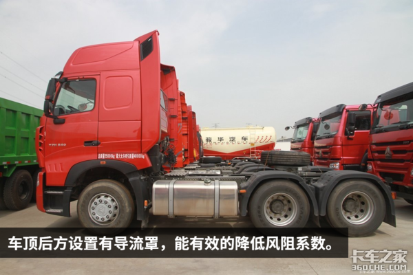 豪沃T7H采用高顶驾驶室的设计,看起来十分的威猛大气。后方设置有导流罩,能有效的降低风阻系数,提升燃油经济性。