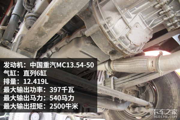 动力方面重汽T7H采用的是中国重汽MC13.54-50直列6缸的发动机,该款发动机是重汽引进曼技术后新开发的,最大输出功率397千瓦、最大输出马力540、最大输出扭矩2500牛米,满足国五排放要求。