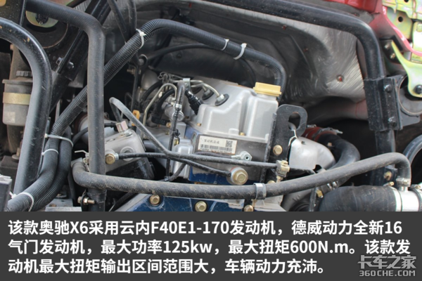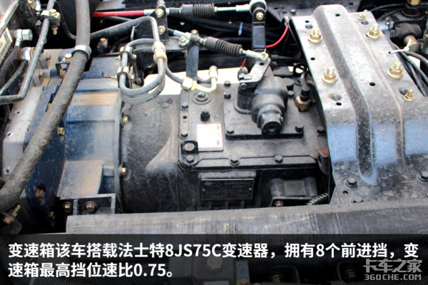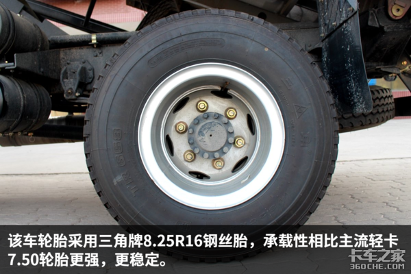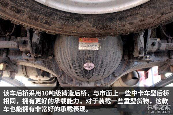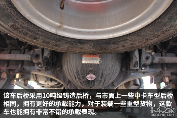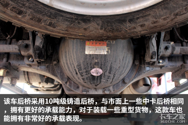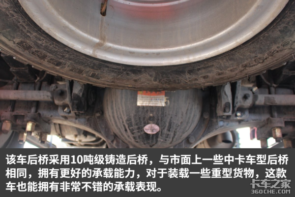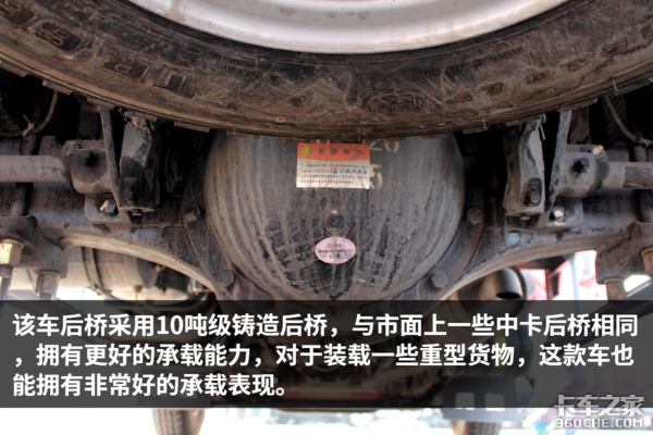 该车后桥速比4.875,通过卡车之家车速计算器可知这该车发动机在1500—1800转时,挂入最高挡车速为66—78km/h,非常适合城乡重载运输、建材运输。