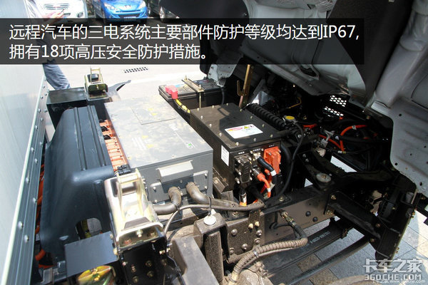 在安全方面,远程汽车的三电系统主要部件防护等级均达到IP67,拥有18项高压安全防护措施,确保性能稳定。并且,在这台车上采用了纯电动轻卡上比较少有的气刹制动带ABS防抱死功能。