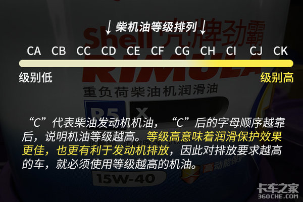 根据不同的字母标注,就可以将机油等级进行排列,字母越靠后说明机油的性能越好。且字母靠后的机油对排放达标更加有例,现在国五排放的车辆,因为有后处理的关系,一般都要使用CI以上级别的机油了。
