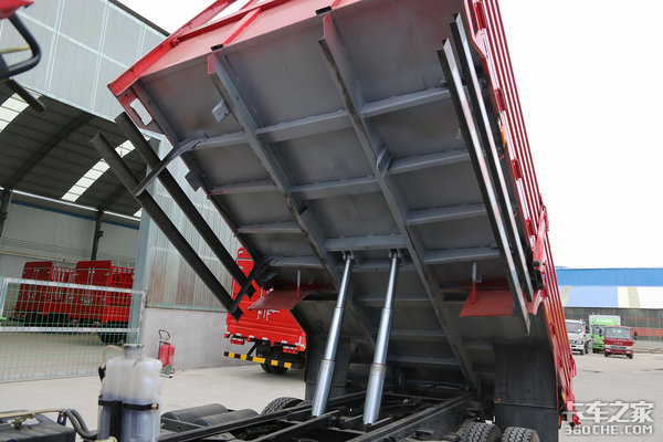 在便用行上,货箱亦可以成为普通的栏板车,将栏板打开拆掉立柱,则可以变成平板,以方便运输一些尺寸较大的物品;亦可以成为普通的自卸车,从而方便用户在不同的运输场景当中,都能够游刃有余。
