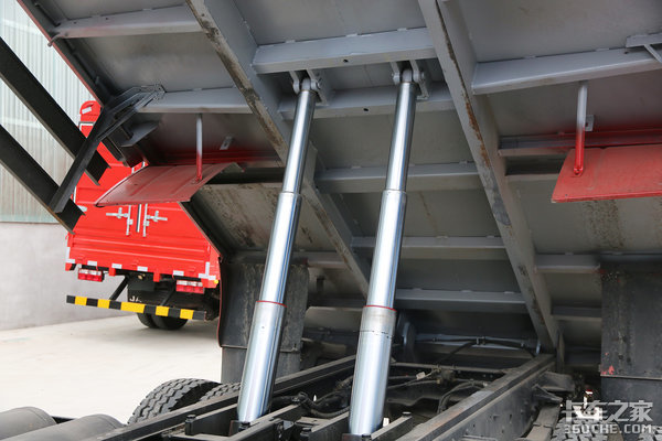 液压举升系统采用中置双杠110,举升的重量更大也更加稳定。举升的角度最大可以达到55度,更方便用户卸货,尤其是运输介质为黏土时能够将货物全部卸掉。操作举升机构的时候切记一定要将车辆停在平整的路面上,并且观察上方是否有电线等。