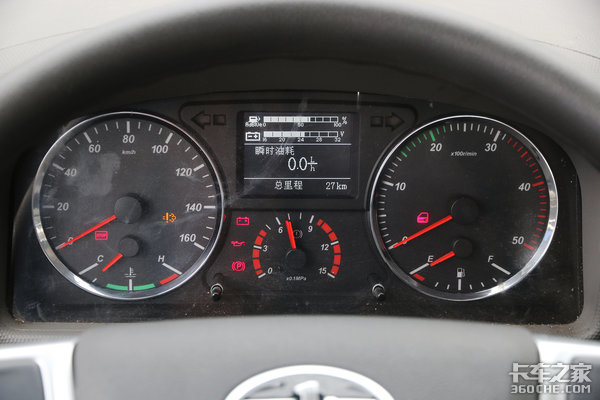 仪表盘设计为黑底银框白字红针,驾驶过程当中读取也非常清晰。仪表盘左边为时速表,里面含有水温表,右边为发动机转速表,下方为油量表;中间区域的上方的液晶显示屏可以显示车辆的各种信息,最中间的位置则为气压表。