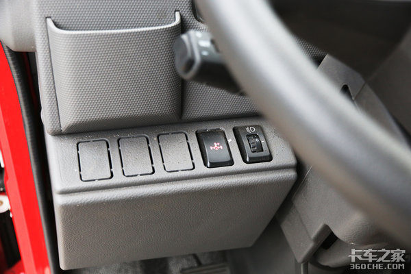 方向盘左侧下方的工作台上为大灯的高度调节和取力器开关,使用取力器时需要先拉起驻车制动,然后踩下离合器,再按下取力器开关,再通过手刹旁边的举升操作机构控制货箱的举升。