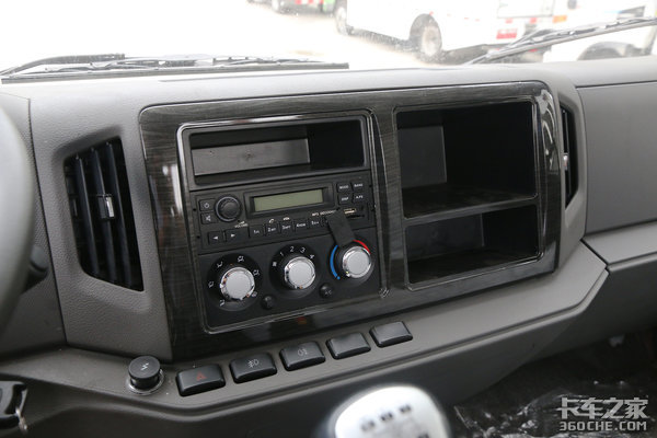 中间的多媒体区域只配备了一个可以插USB和AUX输入,以及具备收音功能的播放器;下方则为手动空调,分别为出风口调节、风量大小以及温度调节,镀铬的旋钮开关看起来比较美观。在它的旁边是多个储物格,方便司机放一些杂物和票据等。