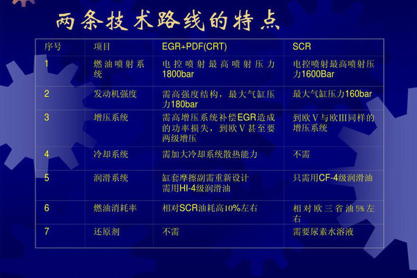 SCR路线是目前大多数厂家采用的,在节能减排方面是比较稳定,只是相比EGR路线每百升油要消耗3%-5%的尿素溶液,但油耗却要比EGR系统节省5%-10%,这也是各厂家采用该系统的主要原因。