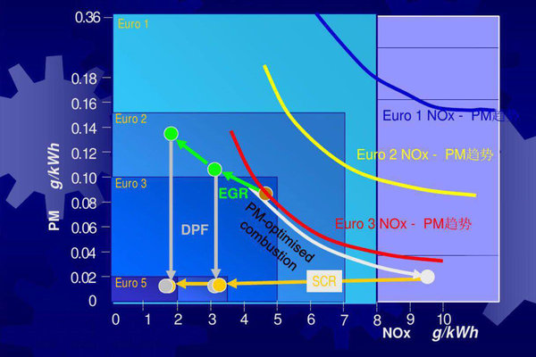 SCR主要解决的排放污染物是NOx(氮氧化物),而EGR在控氮氧化物方面比SCR系统稍差,所以在解决方案上采用了EGR+PDF或者EGR+DOC的路线方针,同时降低PM(颗粒物)与NOx达到相关标准的要求。