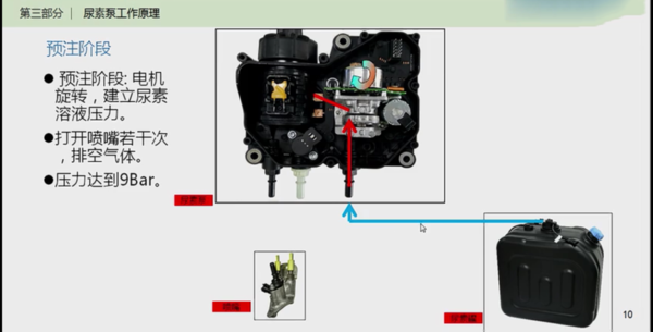 博世采用的是一体式集成计量泵,也就是电机泵。通电后先自检正常后随时待命;电脑板检测排气温度,达到220摄氏度后,即会下达喷射指令。