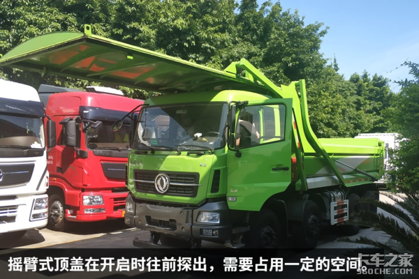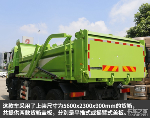 至于货箱方面,这款车采用了上装尺寸为:5600x2300x900mm的货箱,共提供两款货箱盖板,分别是平推式或摇臂式盖板,这两种各有优缺点,用户还请根据自己使用工况选择。货箱整体容积为11方左右,符合深圳市对新型泥头车的规定,而且未来在深圳运行的新型泥头车也基本是这个尺寸,通过标准量化的尺寸限定泥头车的货箱,避免超载超限的情况。