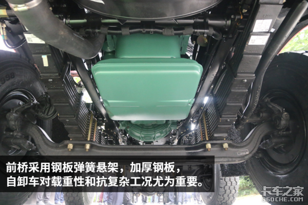 该车速比为5.921,更加适合自卸车工作环境。前、后桥均采用了多片弹簧承载结构,能保障车辆大重量的承载性。