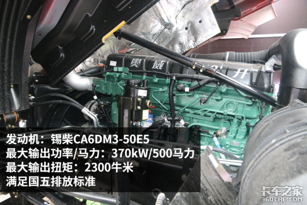 该车搭载的是一款锡柴CA6DM3-50E5发动机,最大输出功率370千瓦,拥有500马力以及2300牛米的最大输出扭矩,同时满足国五排放。对于一款自卸车来说,这样的马力简直是要“逆天”。