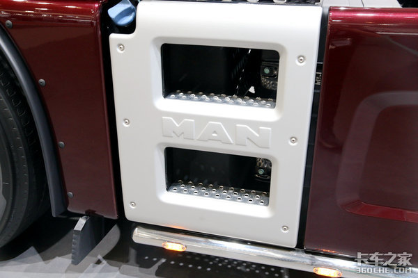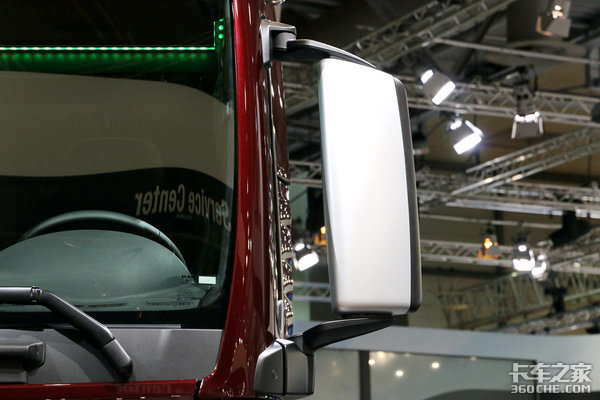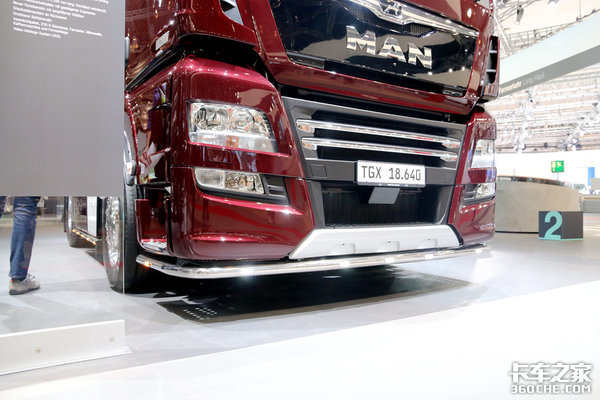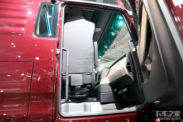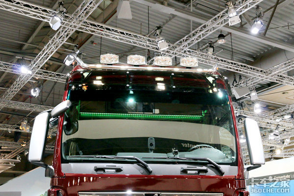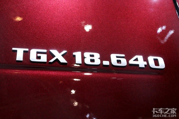 我一般记不住曼TGX驾驶室的具体型号分类,我都会看曼的车门上方有没有长条形玻璃,如果有,那么十有八九就是曼TGX最大号的XXL驾驶室了,而看这款车的展牌,我们也能得知它就是最大号的XXL驾驶室。