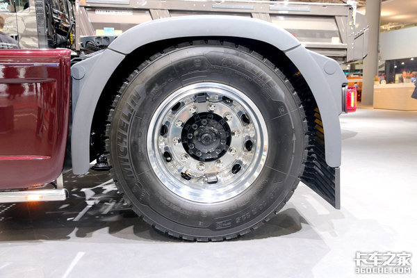 前轮采用米其林牌的385/55R22.5型号真空胎,车轮则采用铝合金材质,这轮圈亮的能当镜子使。