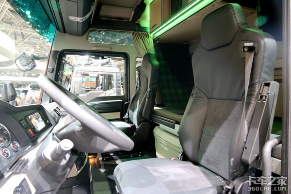 最后我们可以看到,这款车的副驾驶座椅支持旋转操作,欧洲卡车司机大多数时候都是一个人跑车,也会经常在车上吃饭、休息。副驾驶座椅可以旋转,尤其在吃饭的时候,能够给司机提供很大的便利。