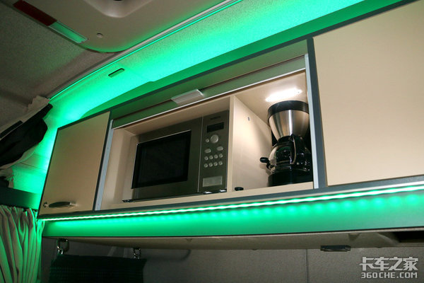 这台曼TGX不是双卧铺车型,它将上卧铺改成了储物箱,放置了咖啡机、微波炉,并且添加了可以变色的氛围灯,晚上一个人在密封的卡车内喝着咖啡、唱着嗨歌、氛围灯一闪一闪的,我咋觉得这不像是卡车司机的生活?