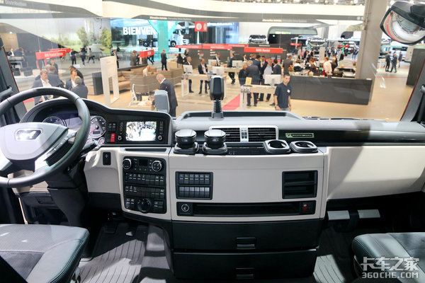 曼TGX的工作台设计跟其他品牌的卡车不太一样,相对司机在驾驶室行走更加方便,米色和黑色的搭配还是很时尚的,主副驾驶布置有专门卡放水杯的地方。