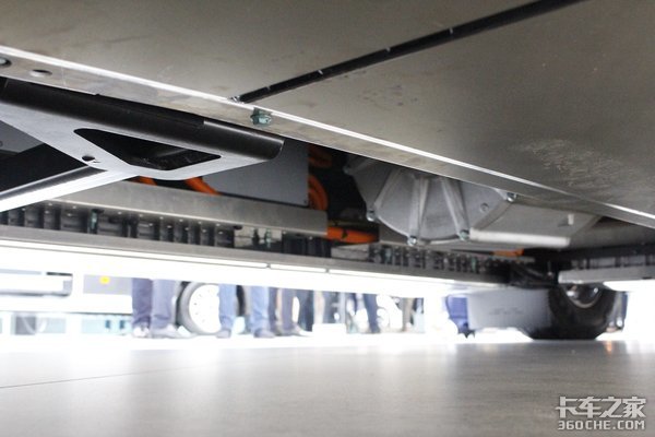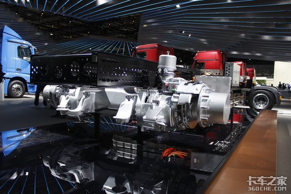 在eActros车辆的旁边,还展示了同款的底盘,能看到eActros搭载的是两台轮毂电机,驱动力传递更直接同时也更易控制。而电池则是采用独立电池组分装在底盘附近。根据这个底盘上的资料介绍,这款电动车底盘为了应该还以衍生出11.5吨级的eAchse和eAxle车型。