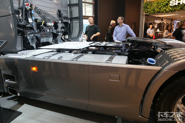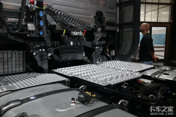 驾驶室后方的工作区域都采用镀铬材质进行包裹,可以保护底盘的零部件。之前有卡友疑问,包裹这么严,出现问题怎么维修呢?呃……这可是斯堪尼亚旗舰车中的旗舰车,主打可靠、高效,没你想得那么容易坏,这样的设计也可以看出斯堪尼亚对自己产品的自信。