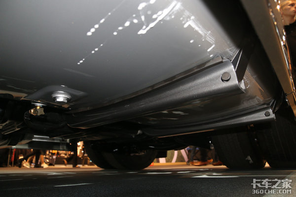 硬件方面,这款车的前桥采用的是9吨级空气悬挂,后桥采用的是13吨级空气悬挂。对于底盘零部件包括油箱、发动机等的保护非常仔细,都带有防护措施。