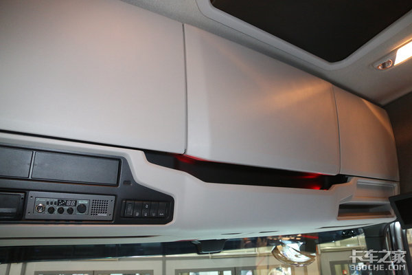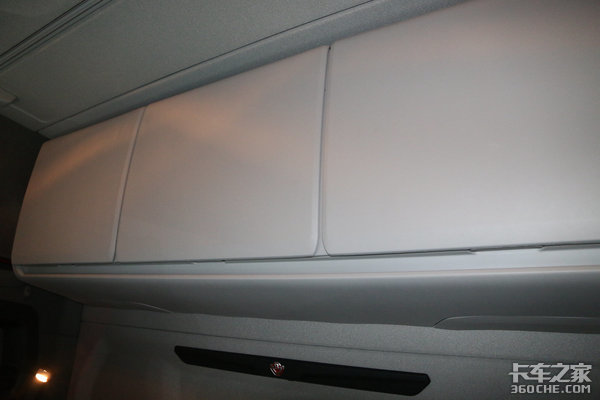 这款车的储物空间也非常的惊人,主要有四部分,包括驾驶室顶部前方、驾驶室外部的两个大工具箱、卧铺下方,还有卧铺上方,都设计了大型储物箱,将空间利用到极致。这也和欧洲长途大都单人单车有关,如果可以引进到国内,恐怕卧铺得设计成上下双卧铺。