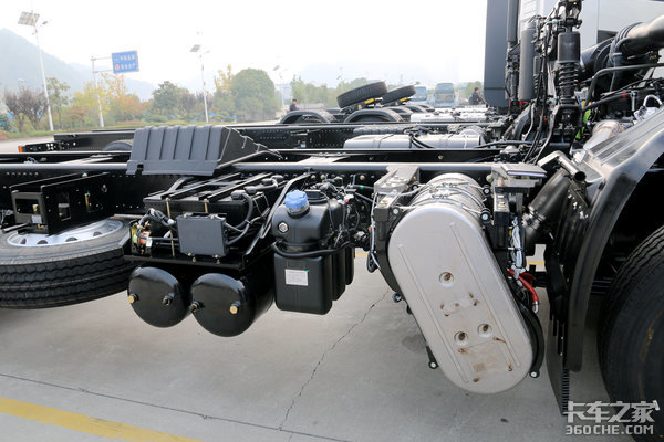 克诺尔空气处理单元的安装位置挺有意思,在车架下方,并且朝向内侧,这跟很多品牌卡车的安装位置还是区别很大的。