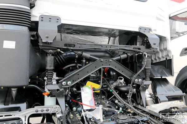 虽然这台新天龙KL没有采用四点空气悬置,但是驾驶室后面采用了两个竖置弹簧减震器和两个横置液压减震器;驾驶室前部采用两个液压减震器和两个弹簧减震器,这样的驾驶室悬置减震应该比四点空气悬置更舒服吧。