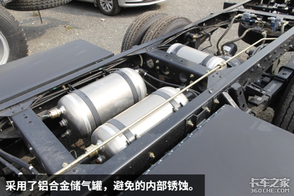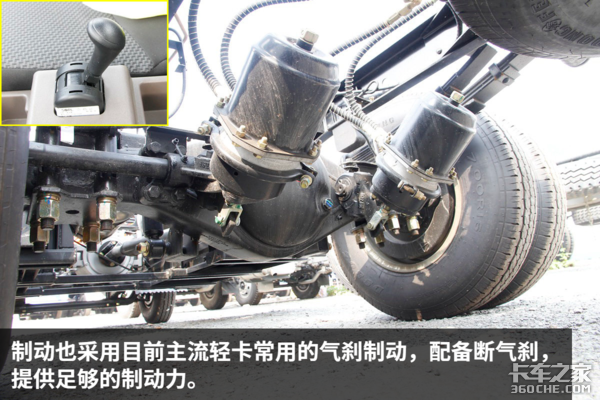制动方面也采用了目前主流轻卡常用的气刹制动,这是由瑞立提供的一整套系统,包括了电动空压机、干燥罐等,提供足够的制动力。还采用了铝合金储气罐,避免的内部锈蚀。