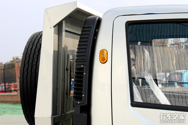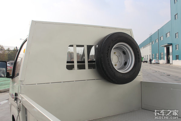 备胎背在车箱前挡的后面,这种设计现在已经很少见了,不知道车主为了多装货,会不会把这个备胎拆下来放在家里。