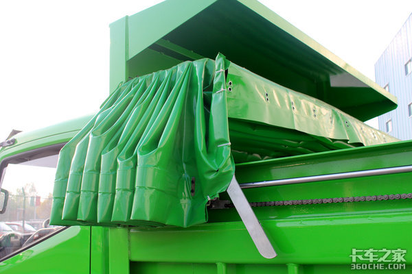 篷布环保盖采用链条铺盖的形式,装好货只需要用遥控器操控“打开”,这个篷布就会从前至后盖住货箱,不用的时候按一下“关闭”就能把篷布折叠起来。