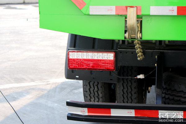 从货箱尾部就能看清楚这台车的货箱是“U”型的,“U”型自卸车箱在倾倒散装货物时,相比有棱角的货箱,它不易粘住泥土,倾倒的更加干净。