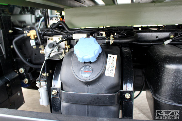 尿素罐布置在车架左侧,跟油箱紧挨着,尿素罐的加注口方向设计符合人机工程学,方便驾驶员给车辆添加尿素溶液。