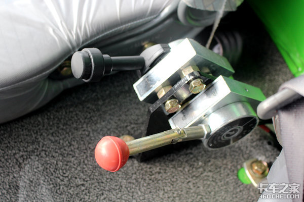 自卸车箱的举升装置就在主副驾驶中间,一个是举升落下的操作杆,一个是锁止操作开关,用黑色和红色区分开,可以有效的预防驾驶员误操作。
