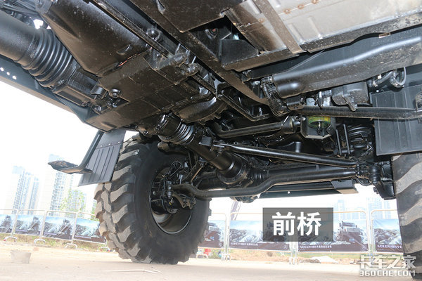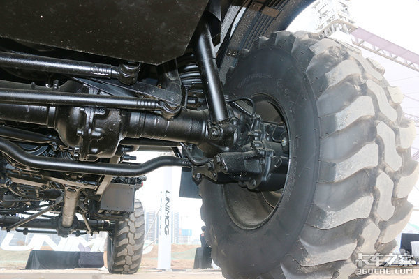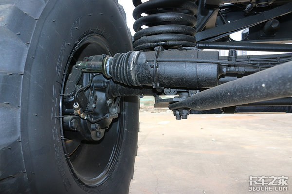 前后非独立悬架整体桥,它没有像公路载重车辆一样采用钢板弹簧承载,而是应用压缩拉伸行程较大的「螺旋弹簧+筒式减震器」,使车桥的纵向活动更自如,让轮胎充分接触地面。