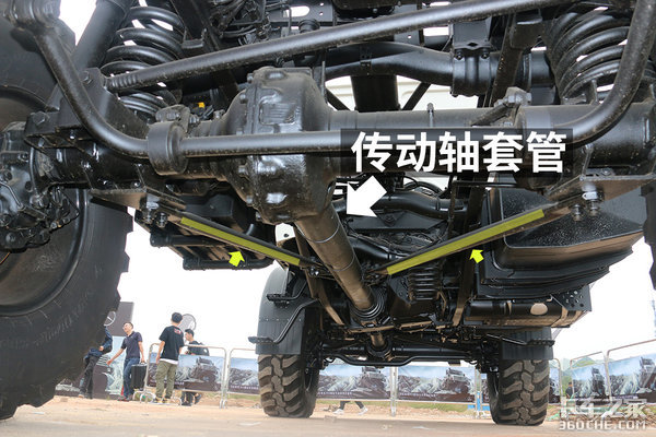 由于悬架的设定,车桥与车架之间其实没有太稳当的连接。我们可以看到,传动轴套和车桥桥壳之间采用了杆件连接,形成了稳定的三角结构,这样便可抑制车桥在水平方向上的扭转。同时,这种结构没有影响到车桥的纵向活动,车桥依然能够进行30°的对角扭曲。