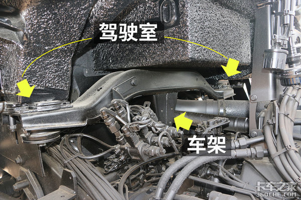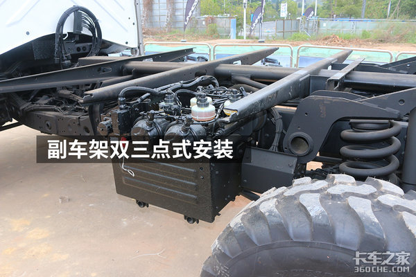 不像点对点的固定连接,「三点式安装」在连接处安装了轴承,让部件之间拥有一定的活动自由度,这样减少了车架扭转时对其它部件的干涉。驾驶室、发动机、变速箱、原厂副梁均采用了「三点式安装」。