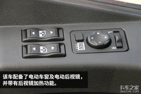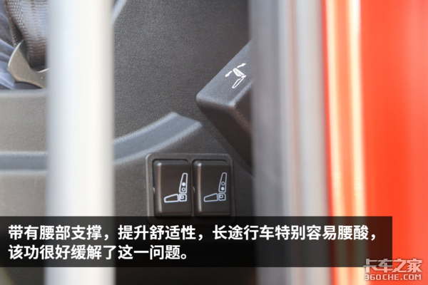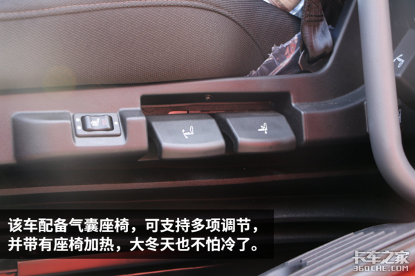 我们仔细看座椅旁边的调节按钮,腰部衬垫及背部衬垫都可以单独调节。气囊座椅坐上去以后,感觉回弹力度还是不错,并可支持多方位调节,找到驾驶员乘坐最舒适的位置,配合四点悬浮驾驶室,可降低疲劳感与颠簸感,这感觉没谁了。另外,该车还带有座椅加热功能,大冬天的再也不用担心冷了。