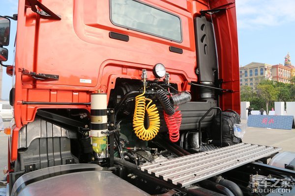 侧面的两级登车梯与解放J7通用模块化设计,方便卡友们在车上接驳主挂车之间的电路及气路设备等。