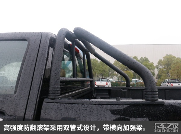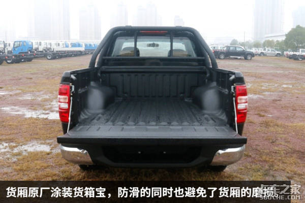 针对载货的特性,在货厢方面骐铃T7也有许多细节方面的设计值得称赞,首先长轴距带来的长度超1.8米的货箱,有效提升了装载空间,其次货箱内部全系涂装了货箱宝,防滑并且免得刮伤货箱。同时为了更好的捆绑车厢内的货物,货箱为配有外置绳钩,而粗壮的高强度防翻滚架也能充当固定点。