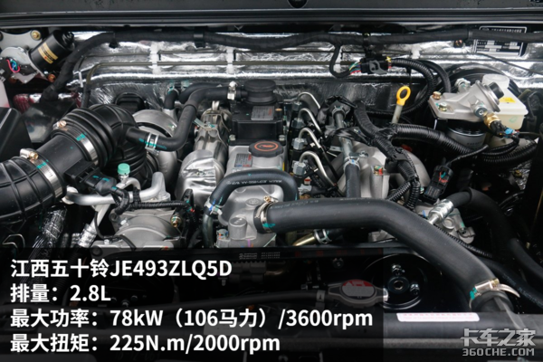 这款机型为经典的2.8L排量,最大功率78kW(106马力)/3600rpm,最大扭矩225N.m/2000rpm。采用高压共轨+增压中冷+EGR+DOC+DPF的技术达到国五排放。