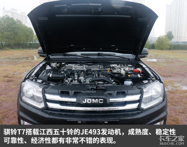 骐铃T7提供了三款动力配套,分别是江西五十铃的JE493柴油发动机、绵阳新晨的V22 2.2L汽油发动机以及沈阳三菱的2.0T汽油发动机,而我们拿到的车型搭载的是柴油发动机,也就是来自江西五十铃的JE493ZLQ5D发动机,相信轻卡的卡友对这款机器都不会陌生,这款机器搭载在多款轻卡上都有搭载,成熟度、稳定性、燃油经济性以及口碑都有非常不错的表现。