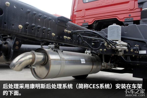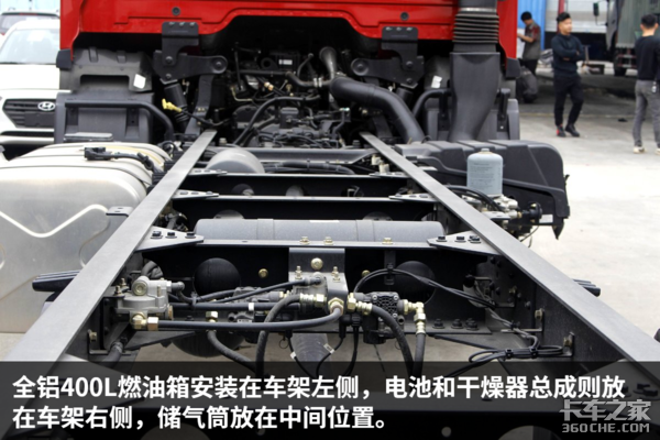 整体来看,车辆底盘布局合理,全铝油箱造型美观,储气筒放在车架横梁中间节省空间,管路采用优化方案,不容易磨损,主副钢板弹簧悬架承载性强。