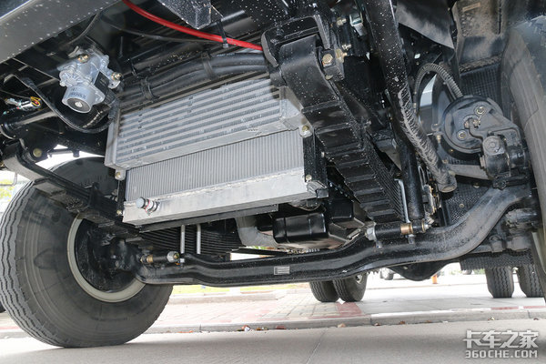 车架宽度865mm,局部双层结构,纵梁截面高度达216mm。车架一侧还留有改装空间,山地运输用户可加装淋水装置。