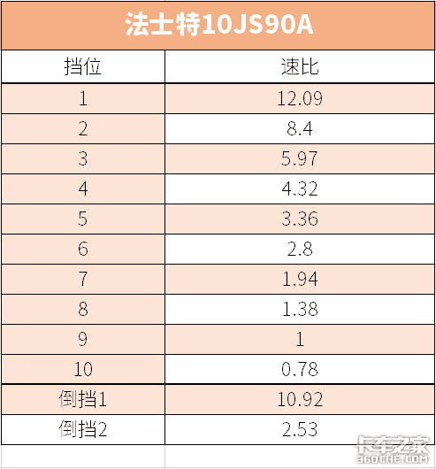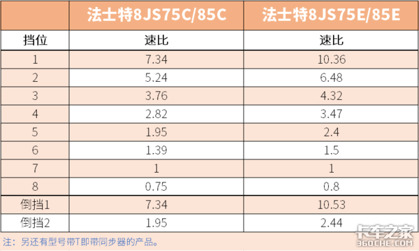 法士特8JS75C(或85C)是许多用户所推崇的,其实从各挡速比分布就能看出,它属于密齿比、级差小的类型,因此在整个挡位范围内升降挡都会较为顺畅,还能很好地兼顾油耗,适用于平原公路物流。但是它的低挡速比并不算大,所以如果是山区的重载运输,可能会有点力不从心。