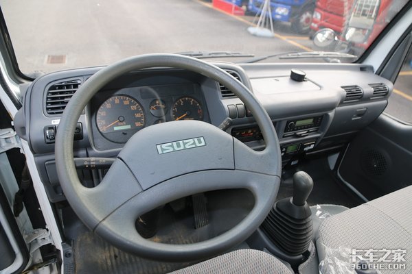 驾驶室内和常规的庆铃100P车型基本一致,整体设计算是非常经典了,在配置方面有车载广播、空调、大灯调节等基本舒适性功能。
