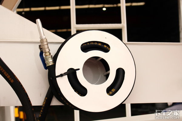 冲洗系统方面,这款车装配了一个450升的气压式水箱,方便用来清洗罐体。在挂车尾部也有一个专门的绞盘用来整理放置冲洗水管。